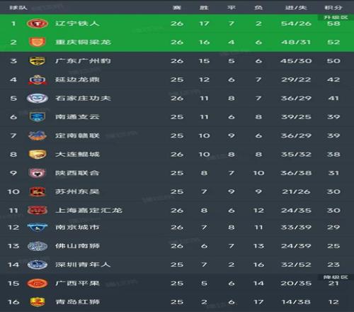 北京时间10月12日,昨天的中甲联赛第26轮率先结束了4场对决,最新积分榜如下!