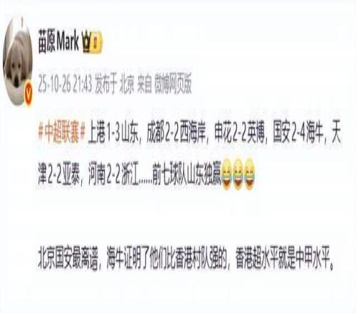 足球记者苗原老师则表示,“上港1-3山东,成都2-2西海岸,申花2-2英博,国安2-4海牛,天津2-2亚泰,河南2-2浙江……前七球队山东独赢。北京国安最离谱,海牛证明了他们比香港村队强的,香港超水平就是中甲水平。