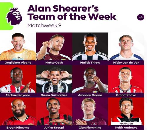 英超官方发布了阿兰-希勒评选的英超第9轮最佳阵容,姆伯莫、扎卡、范德芬、维卡里奥等人在列。