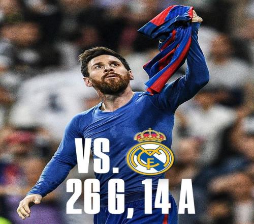 梅西是国家德比历史第一射手和助攻王,对阵皇马26进球14助攻,都是历史第一。梅西对阵皇马还有过各种夺冠和名场面,比如从中场就开始单挑皇马整条后防线,这个进球被欧冠官方认证为欧冠历史最佳进球。梅西还在西甲读秒绝杀过皇马,并且进行经典的晒球衣庆祝。同时梅西对阵皇马还有过6比1、5比0这样的残暴吊打。梅西对皇马的征服还在于征服利益相关者和名宿,弗洛伦蒂诺、齐达内、穆里尼奥、罗纳尔多、劳尔、古蒂、拉莫斯、本泽马、莫德里奇等不同身份和时代的皇马大佬,都在歌颂梅西。