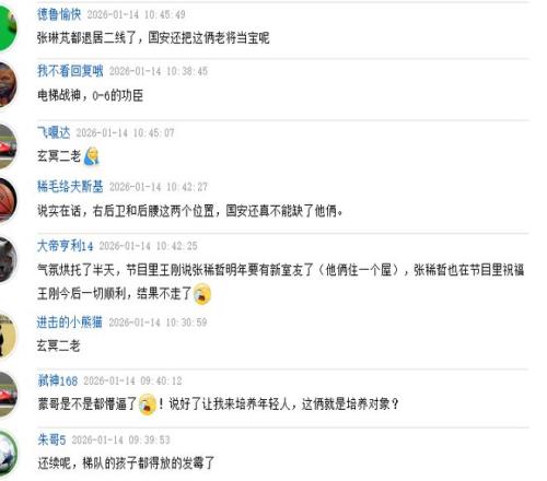 有网友道出球迷感到意外的原因,表示气氛烘托了半天,节目里王刚说张稀哲明年要有新室友了(他俩住一个屋),张稀哲也在节目里祝福王刚今后一切顺利,结果不走了。有人调侃,蒙哥是不是都懵逼了!说好了让我来培养年轻人,这俩就是培养对象?